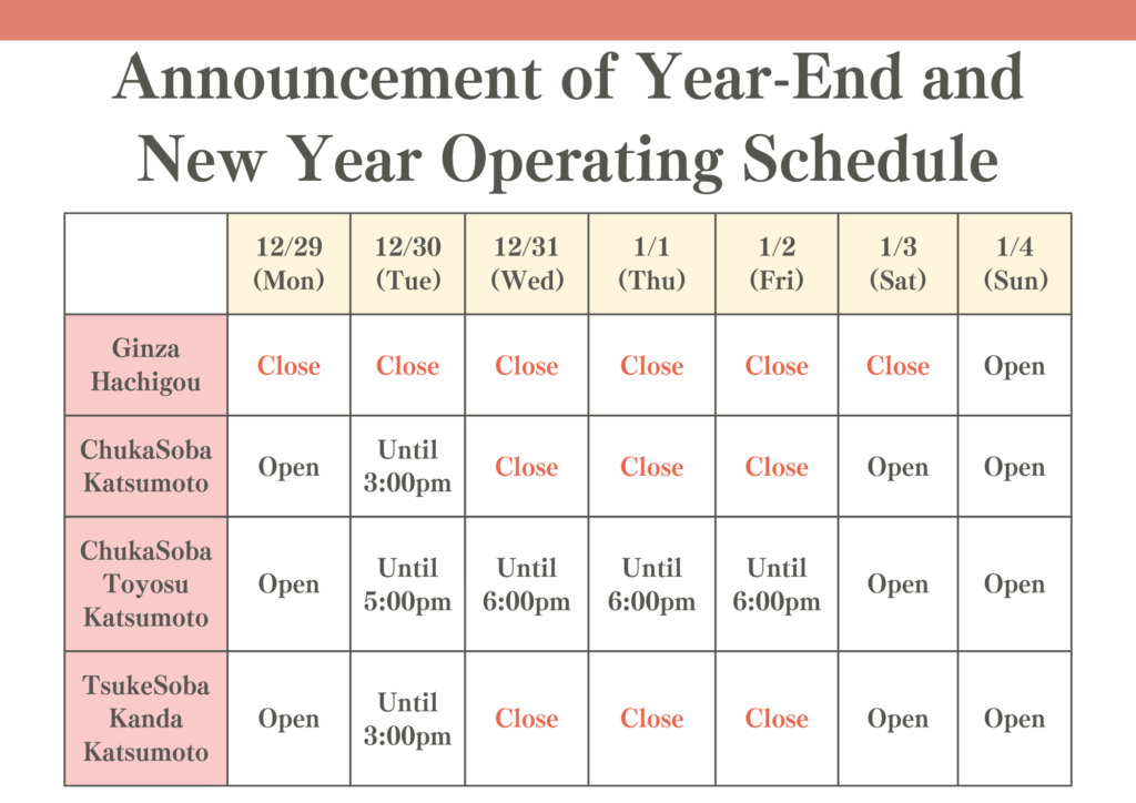 News お知らせ New Year’s holiday opening hours 2025.12.24 Information on opening hours for each store during the New Year holidays. Have a happy new year! Contact Us Company Information